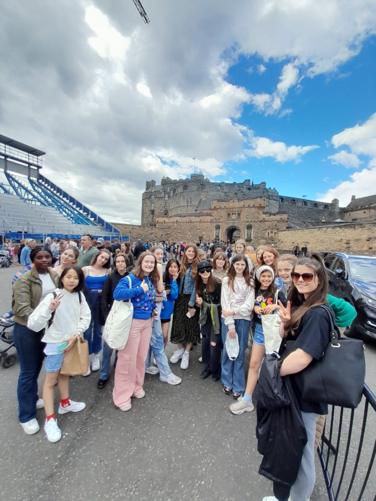 Arriving by train, the girls walked through Princes Street Gardens towards Edinburgh Castle, learning about the Royal Military Tattoo as they processed, with the staging and seating being set up ready for a performance.