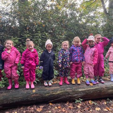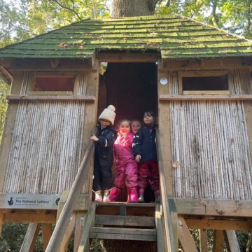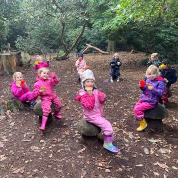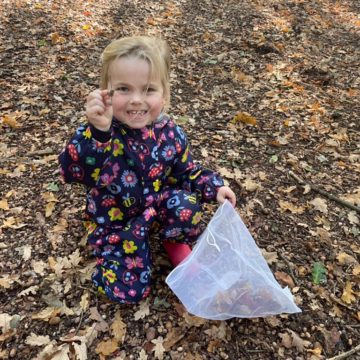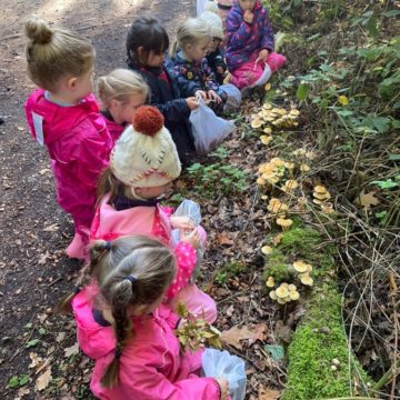 The children walked the circular route around the nature reserve, stopping along the way to climb in the bushes, have hot chocolate and cookies and adventure up into the tree house. They were fascinated by the vast numbers of acorns on the ground, the variety in colour of the leaves, and the amazing fungi along our route. Each child carried a mesh bag to collect their chosen ‘treasures’ to take back to school.
